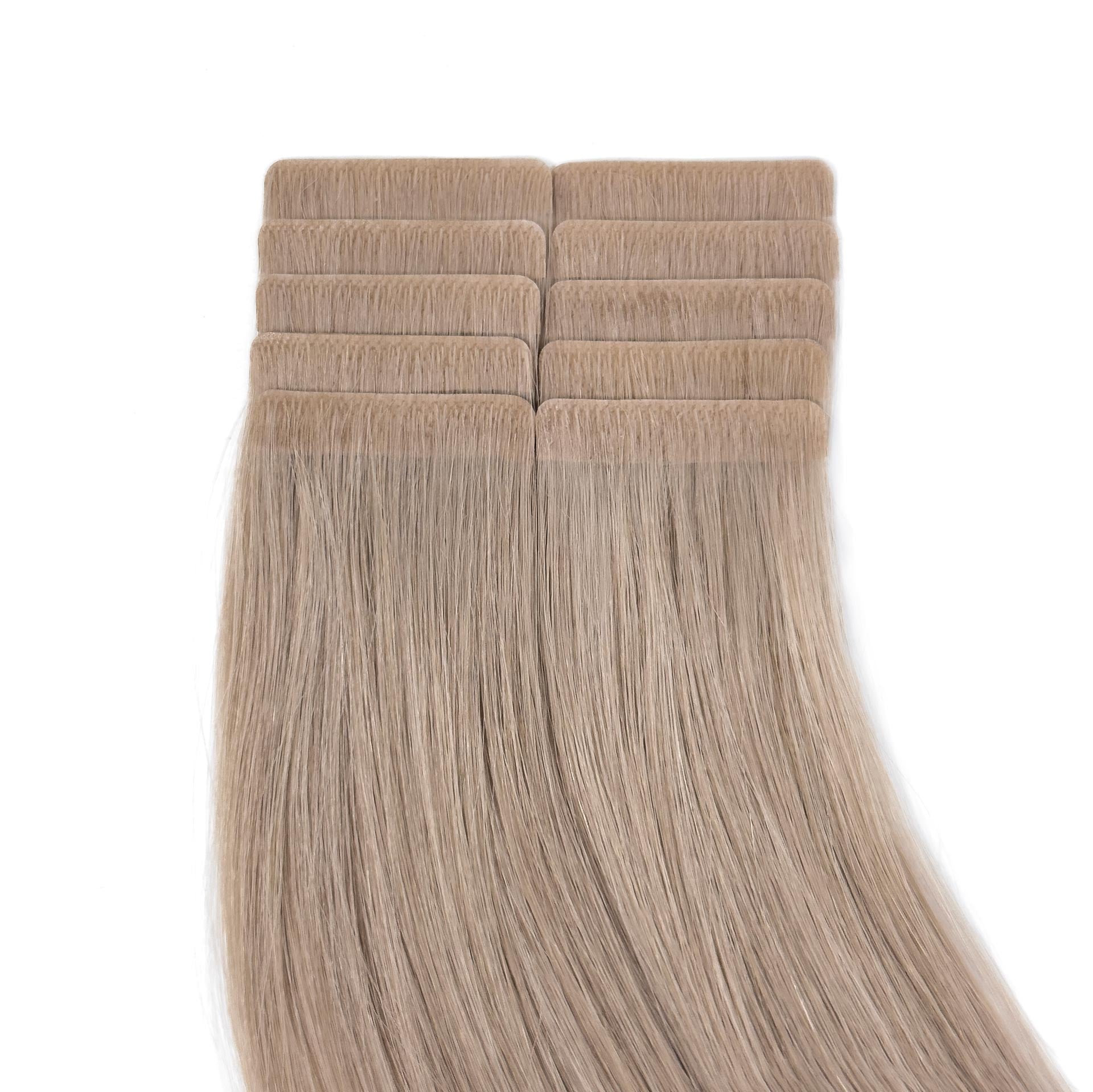 Entdecke unsere hochwertigen Tape-in Extensions in der Farbe Almond Macchiato, ein edles Beige-Blond, das durch leichte Champagner-Reflexe besonders strahlend wirkt. Ein vielseitiger, luxuriöser Blond-ton, der Eleganz und Leichtigkeit verbindet.