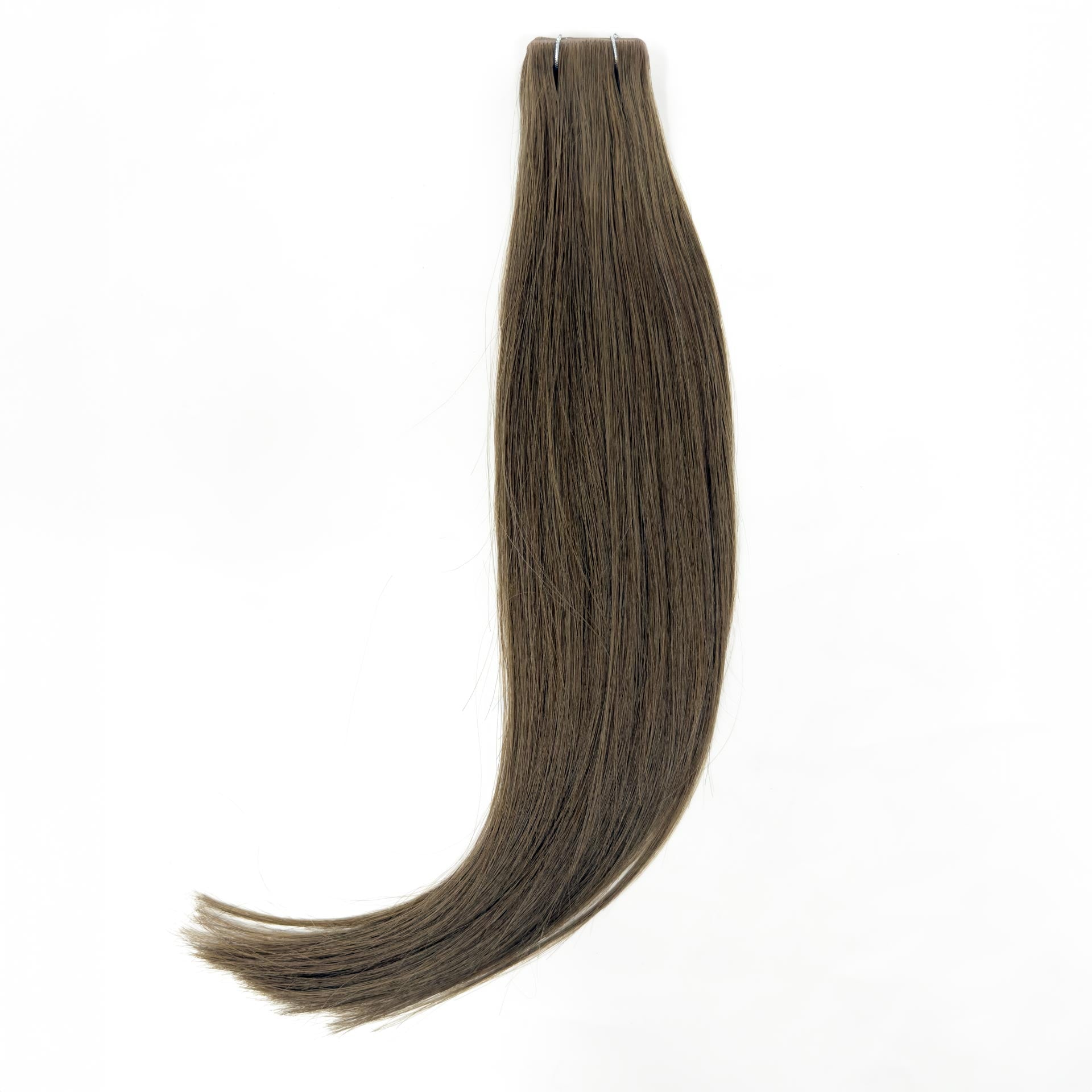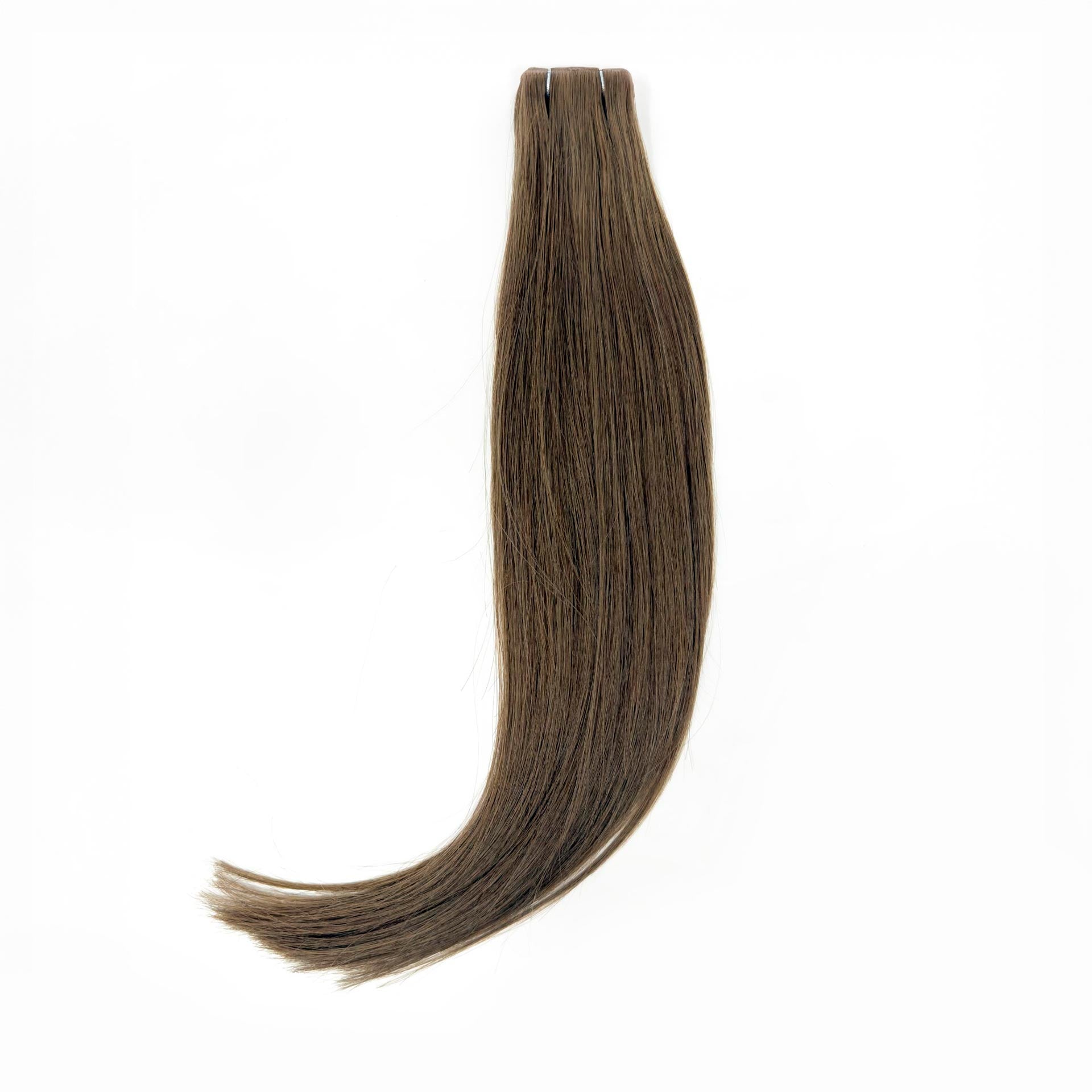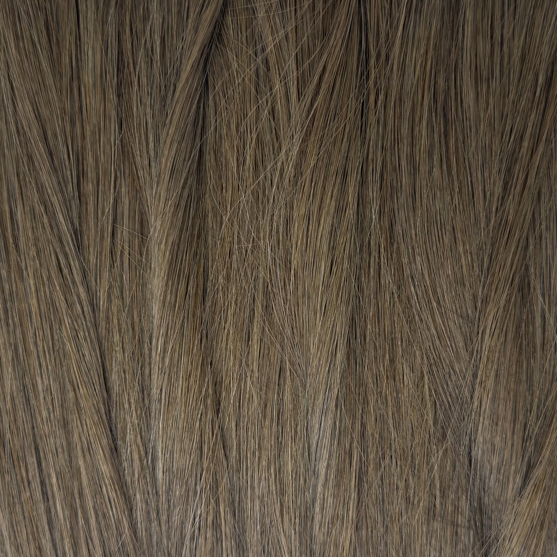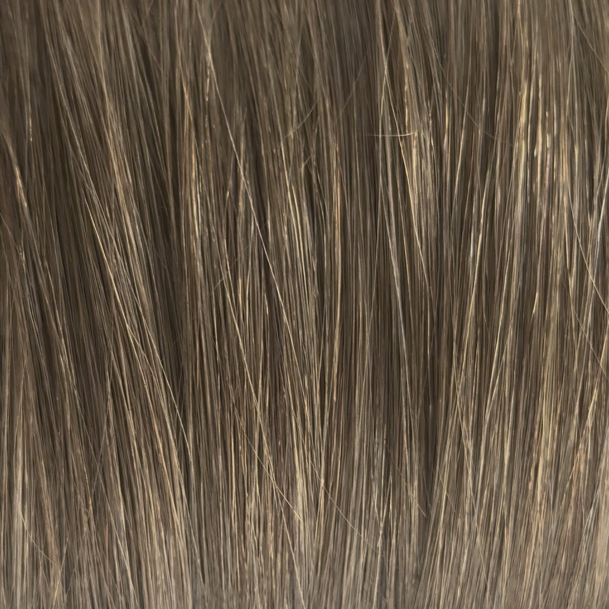 Entdecke unsere hochwertigen Tape-in Extensions in der Farbe Chai Smoke, ein gleichmäßiges Mittelbraun, das Natürlichkeit und Ausgeglichenheit verkörpert. Der neutrale, sanfte Ton passt sich vielseitig an und sorgt für einen stilvoll schlichten Look.