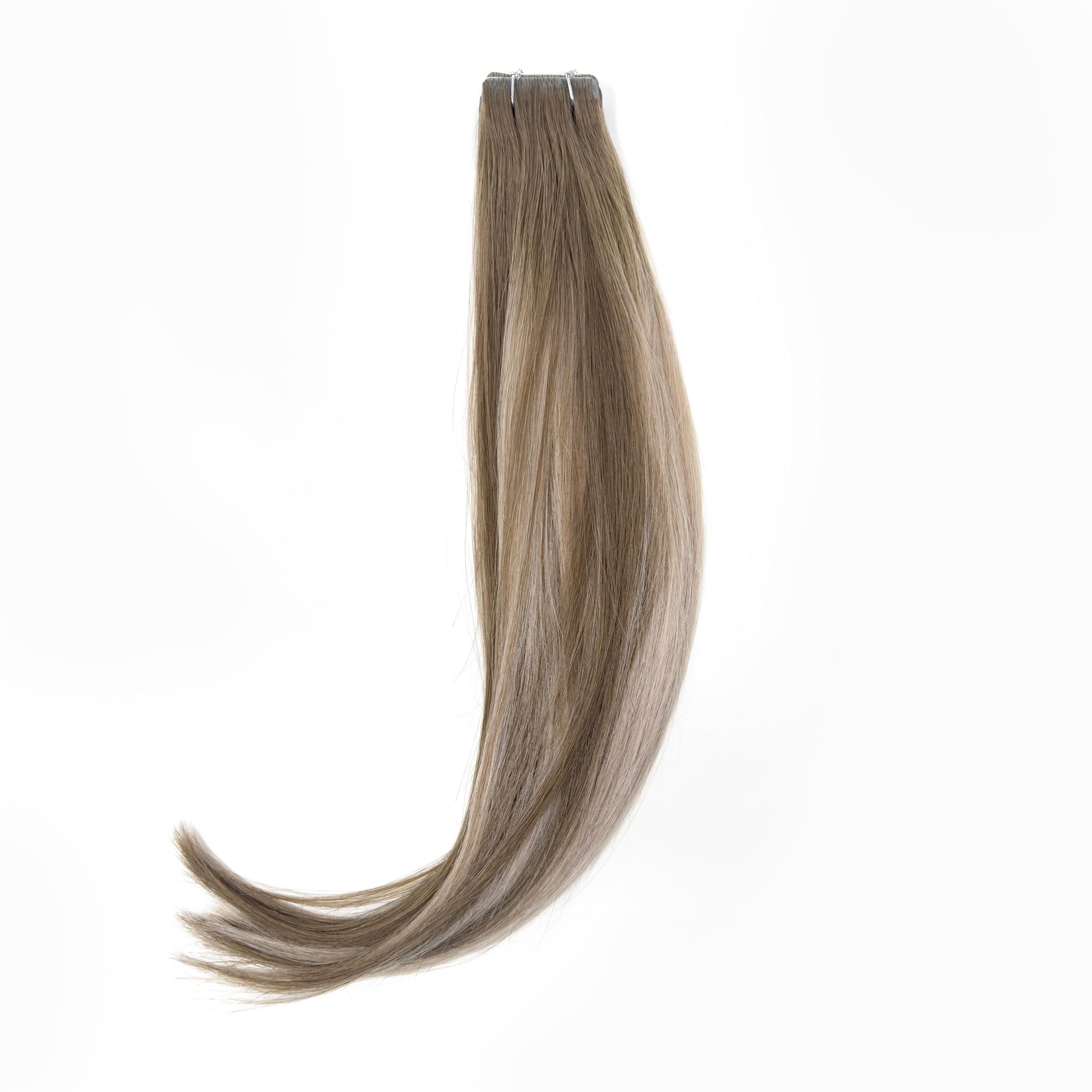Entdecke unsere hochwertigen Tape-in Extensions in der Farbe Frosted – ideal für alle, die einen kühlen, modernen Balayage-Look lieben. Der Ansatz beginnt in Mittelblond mit einem aschigen Touch, der sich in die Längen zieht und in ein sanftes kühles Lichtblond übergeht. Diese Extensions bieten dir den perfekten, kühlen Farbverlauf.